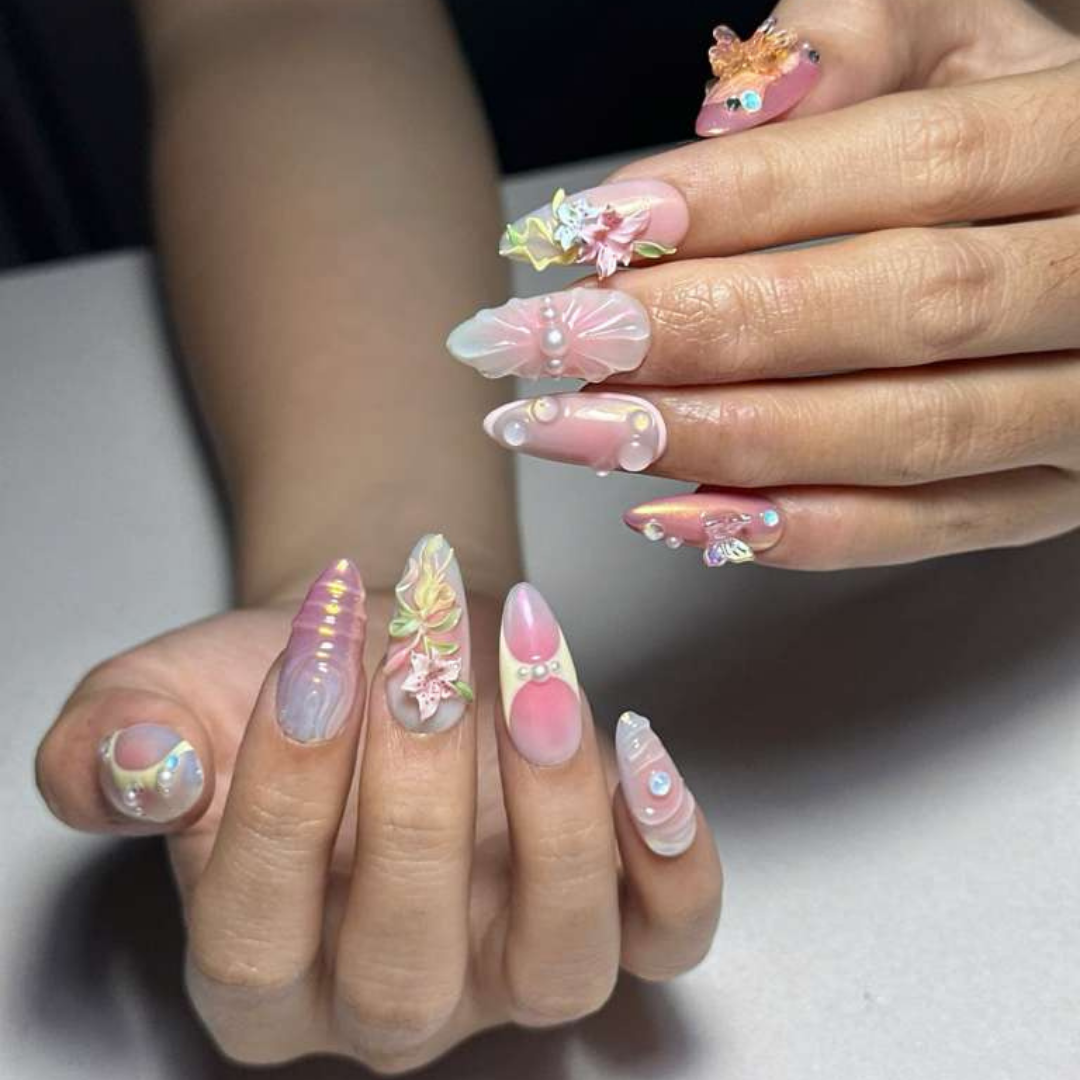 Every set is hand-designed and individually finished, featuring multiple layers of gel that are properly cured to ensure long-lasting wear, shine, and detailed artistry.