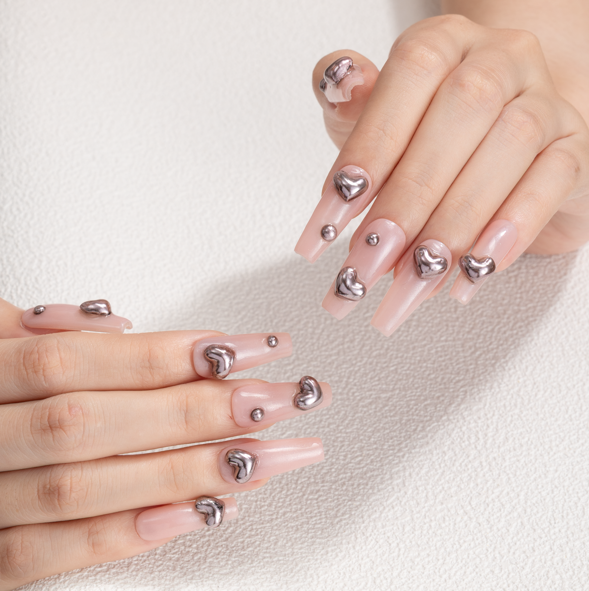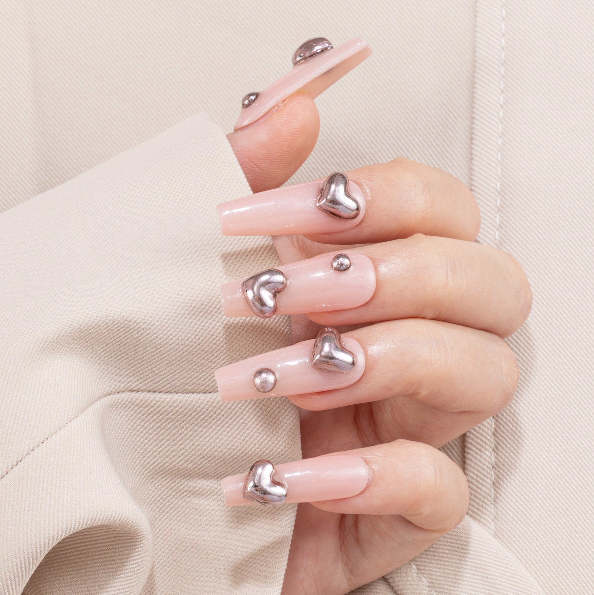 Sheer blush nude press-on nails with glossy finish, featuring raised silver chrome heart accents and minimal metallic studs. A modern, romantic press-on nail set perfect for everyday wear, dates, weddings, and soft glam looks. Elegant, trendy, and handmade with care.